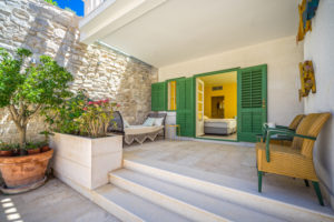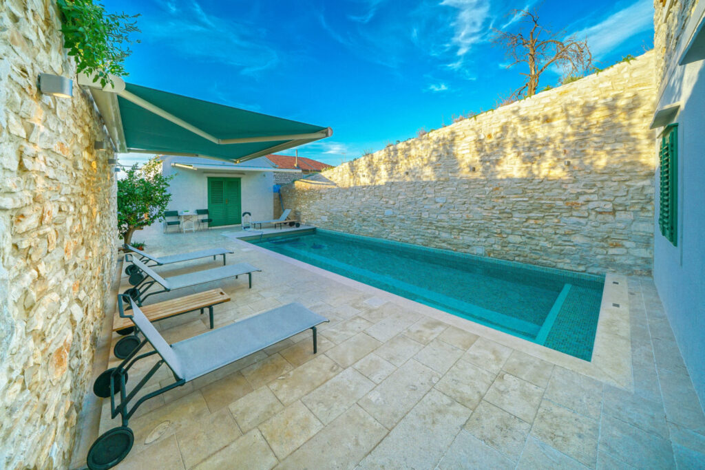 Als je de poort open doet kom je binnen op een adembenemende binnenplaats. Rechts bevindt zich de originele, geheel gerestaureerde ‘Konoba’: beneden een hele ruime woon/eetkeuken, keuken goed ingericht met alles erop en eraan (waaronder een aparte wijnkoelkast), een grote eettafel, zithoek bij een haard. Open trap naar boven waar een master bedroom met badkamer is. En een 2e ruime slaapkamer met badkamer en suite.