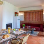 Appartement met 3 slaapkamers. Woonkamer met sofabedden en open haard. Kitchenette. Eettafel met stoelen. Airco. Balkon met tafels en stoelen.